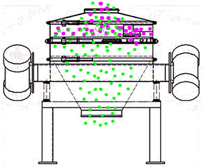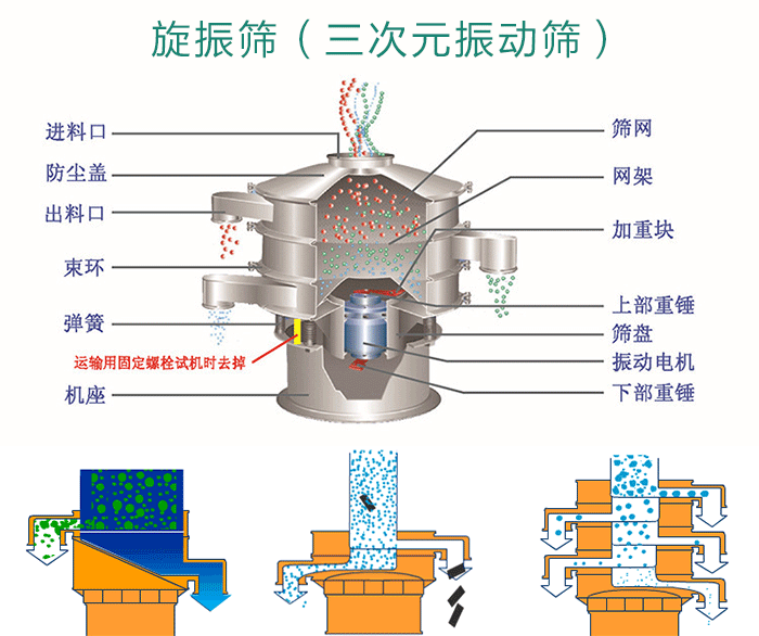 旋振篩是由電機(jī)提供振動(dòng)源,從進(jìn)料口投入物料,在振動(dòng)狀態(tài)下穿過篩網(wǎng)直到出料口;防塵蓋、束環(huán)是為振動(dòng)篩提供封閉狀態(tài)的。