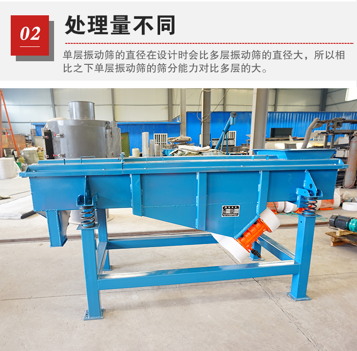 單層振動篩與多層振動篩在物料的篩分結(jié)果中會有,不同的分級例如:單層振動篩在篩分物料的時候只能篩分出兩種不同級別的物料,而多層振動篩就能夠篩分出多種不同級別的物料。