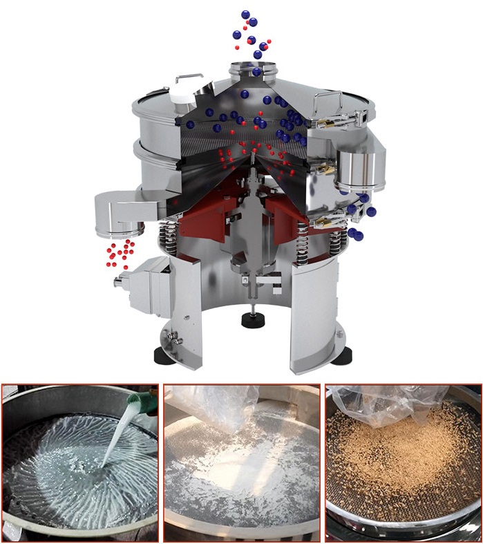 氣旋篩使用一組槳葉將產(chǎn)品推出篩網(wǎng)圓柱體,高速旋轉(zhuǎn)它們并對(duì)產(chǎn)品施加離心力,圓柱體水平安裝,因此對(duì)槳葉施加輕微的扭轉(zhuǎn)以將產(chǎn)品沿著圓柱體的長(zhǎng)度向下移動(dòng),并且使用螺旋鉆以穩(wěn)定的速度喂入槳葉。與振動(dòng)篩相比,這些槳葉迫使產(chǎn)品通過(guò)篩網(wǎng),從而使它們具有更高的吞吐量,旋轉(zhuǎn)螺旋鉆和槳葉組件的運(yùn)動(dòng)具有分解塊或分離壓實(shí)產(chǎn)品的額外好處。