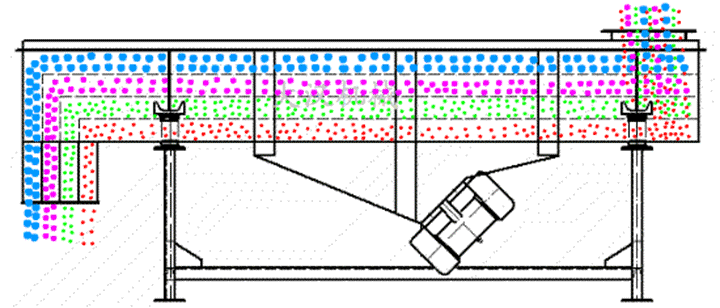 粉煤灰振動(dòng)利用振動(dòng)電機(jī)激振作為振動(dòng)的振動(dòng)來源,使物料在篩網(wǎng)拋起,同時(shí)向前作直線運(yùn)動(dòng),物料從給料均勻地進(jìn)入振動(dòng)篩機(jī)的進(jìn)料口,通過多層篩網(wǎng)網(wǎng)孔大小的不同控制物料顆粒的大小,從而保證不同的物料在不同層級中被排出篩箱外。