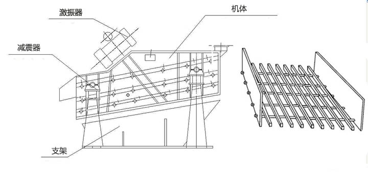 棒條篩工作時,由激振器產(chǎn)生的激振力通過篩箱傳遞給篩箱內(nèi)的篩面上,因激振器產(chǎn)生激振動力為縱向力,迫使篩箱帶動篩網(wǎng)面作縱向前后位移。在一定條件下,篩網(wǎng)面上的物料因受激振力作用而被向前拋起,落下時小于篩孔的物料則透篩而落到下層,物料在篩網(wǎng)面上的運動軌跡為拋物運動,由于這樣周而復(fù)始的物料運動,從而完成物料篩分作業(yè)。
