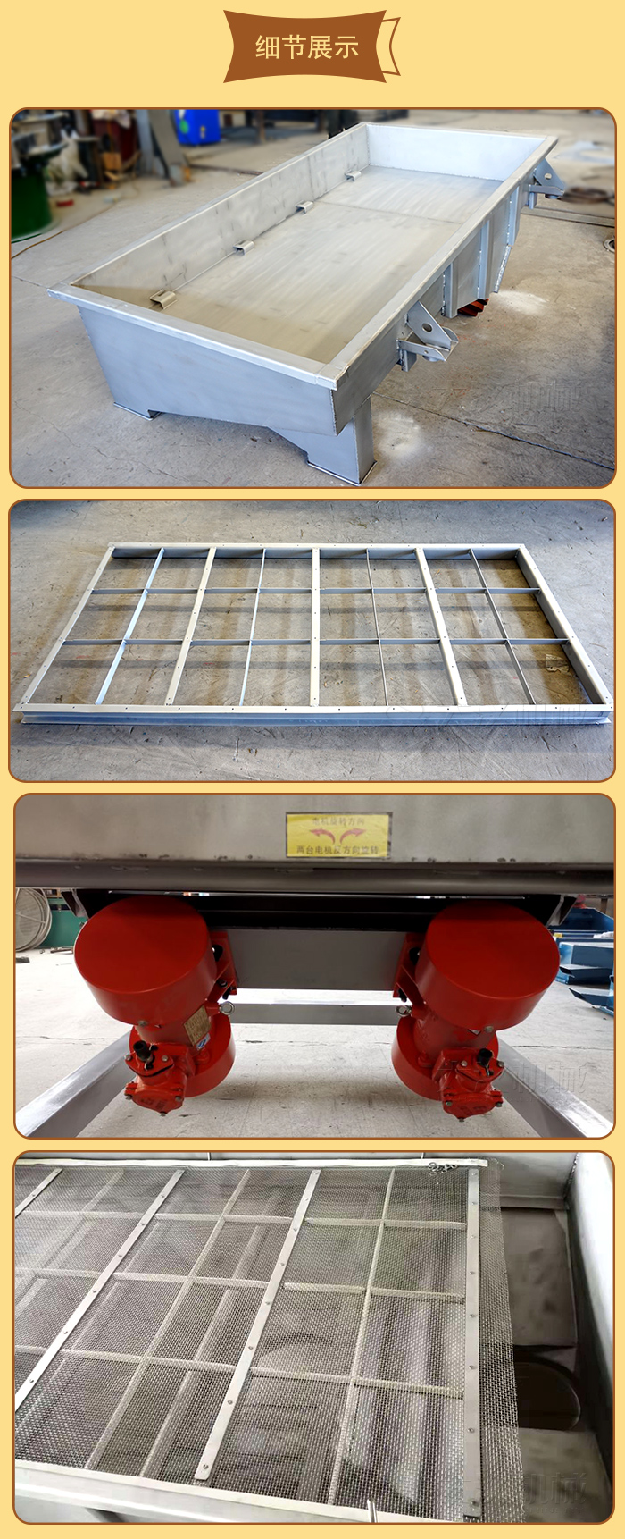 5、電機(jī)臺座:安裝振動(dòng)電機(jī),使用前連接螺釘必須擰緊,特別是新篩機(jī)試用前三天、必須反復(fù)緊固,以免松動(dòng)造成事故。