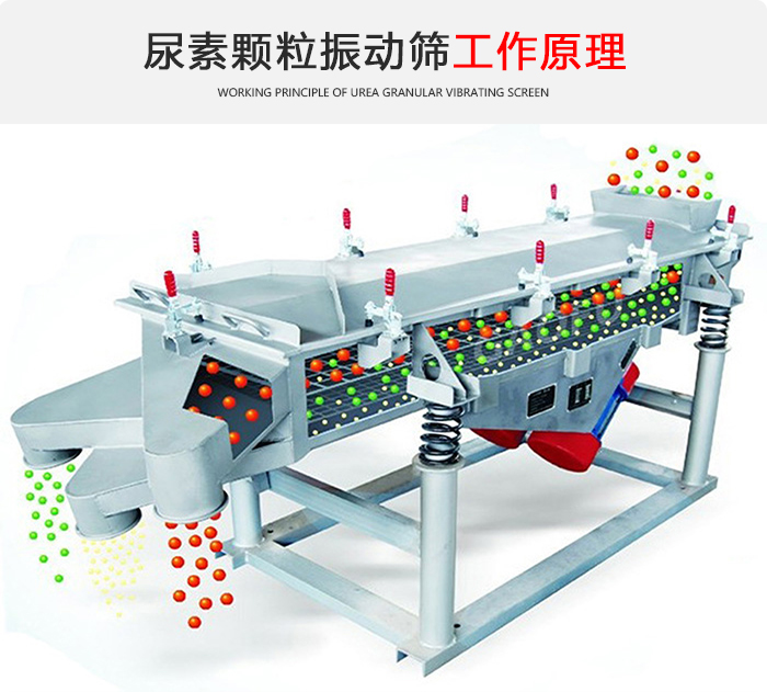 尿素顆粒振動篩主要由篩箱、篩框、篩網(wǎng)、振動電機(jī)、電機(jī)臺座、減振彈簧、支架等組成。